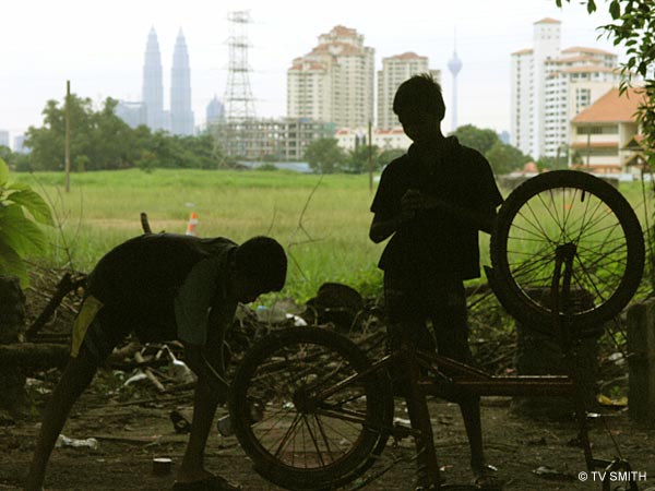 saw some kids repairing a bicycle under