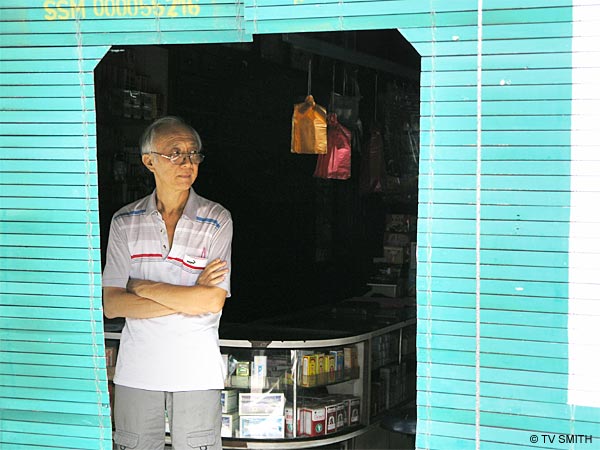 Shop Man, Bidor. A shy shopkeeper behind bamboo chick (or roller blinds).