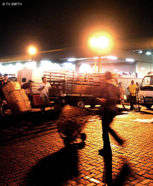 Rush 4:30 am - Outside, trolleys miss each other narrowly as the rush to transport the supplies begins. ISO 400, f2.4, 1/15 sec